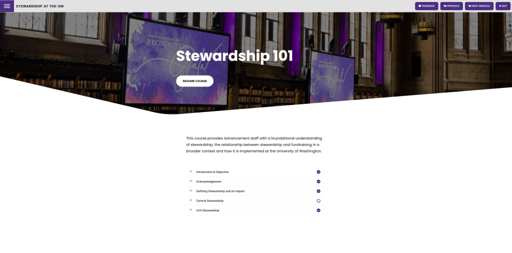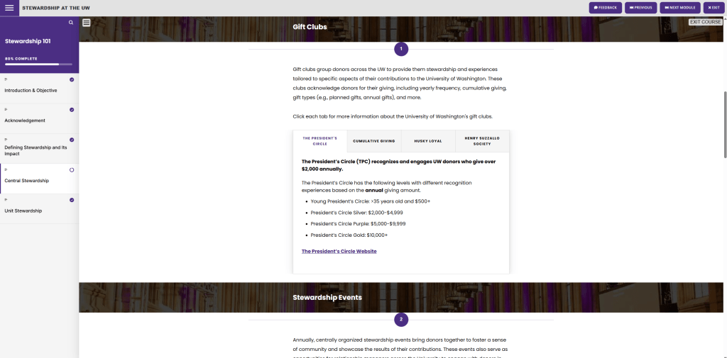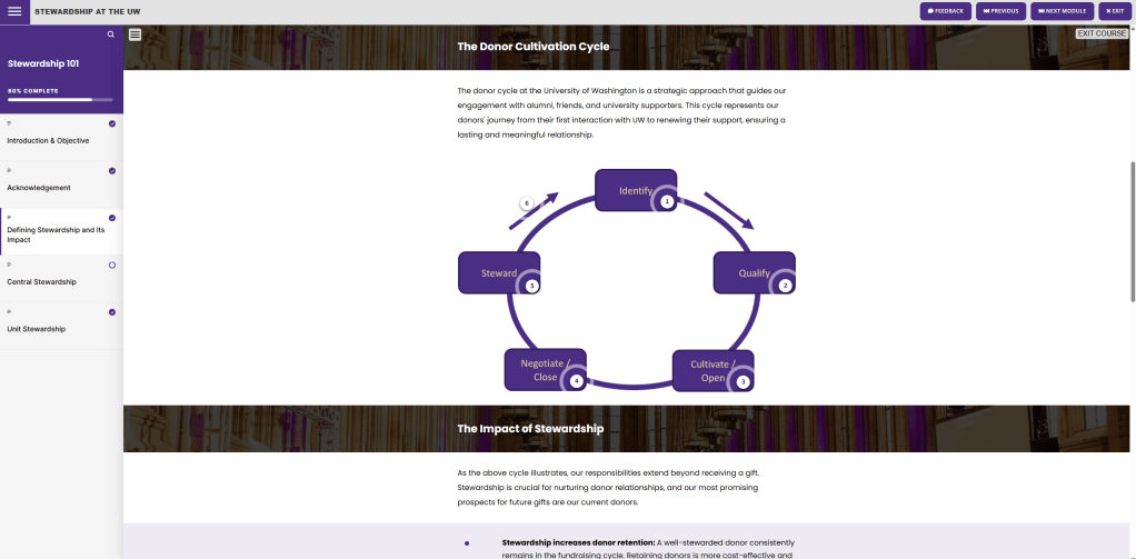 Stewardship 101 was an online course I created for Advancement staff at the University of Washington.